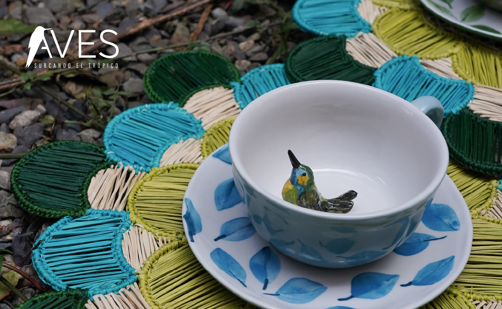 En esta colección convergen saberes tradicionales y procesos contemporáneos, dando vida a objetos donde el color, la textura y el volumen evocan el movimiento, los plumajes y la presencia de estas aves en los distintos territorios del país. Técnicas como el enchape en tamo y en chaquiras, la alfarería, el telar vertical, la talla en madera, el vidrio soplado y diversas cesterías —entre ellas la paja tetera, la iraca y fibras de bosques húmedos y secos— fueron esenciales para traducir los matices tropicales, las iridiscencias de los colibríes, la contundencia de especies como el torito o la delicadeza de aves de páramo. El diálogo entre materiales y oficios permitió materializar desde superficies que recuerdan patrones de plumas hasta volúmenes inspirados en picos, alas o cuerpos en reposo o en pleno vuelo.